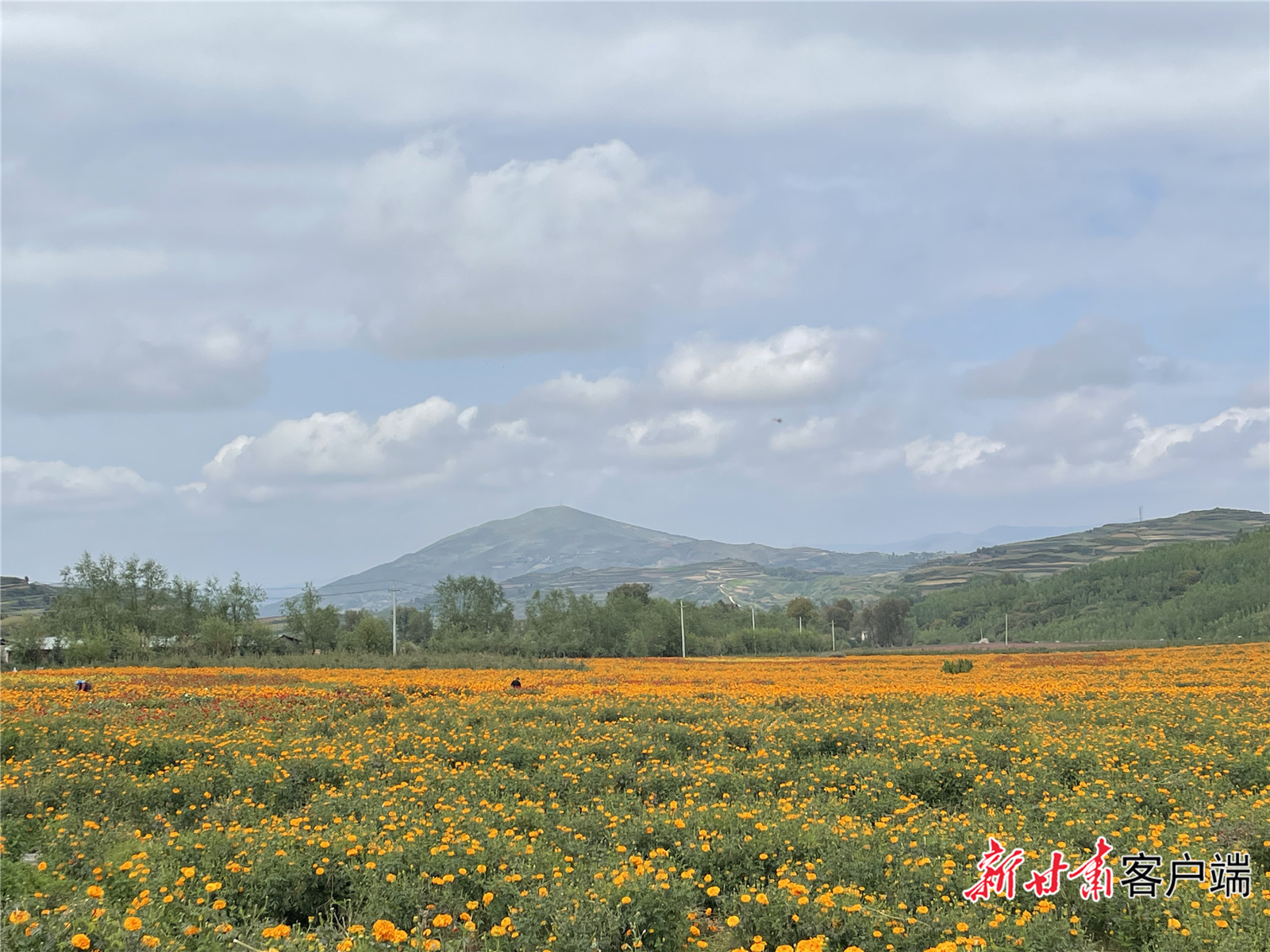 田间,村民劳作身影处处可见,农机声隐约可闻;远眺,万寿菊花海金灿灿一片,大石头河“哗啦啦”流淌;更远处,青山隐隐、白雾袅袅……