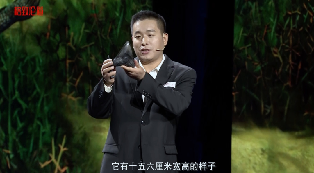 中国科学院古脊椎动物与古人类研究所研究员盖志琨展示巨齿鲨牙齿化石(盖志琨供图)
