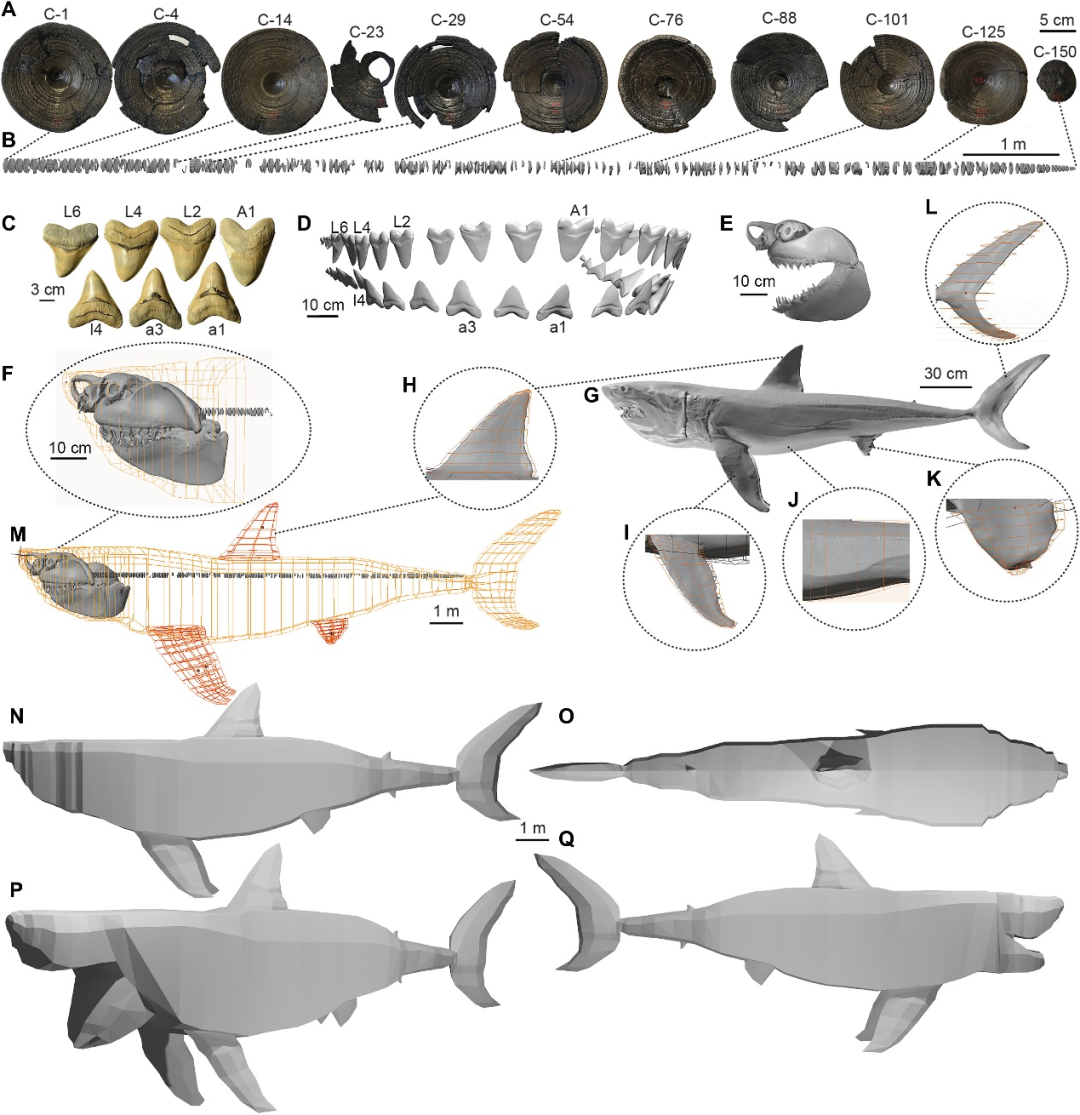 同样是今年发表在《ScienceAdvances》的另一篇期刊中,古生物学家JackCooper将耳形巨齿鲨的脊柱和牙齿三维数据结合现生大白鲨的软颅骨重建计算出了一个完整的巨齿鲨模型。计算来的结果显示了耳形巨齿鲨身长超过15米,体重可达6156公斤,而且游泳速度更快,具有横跨大洋和主动捕食大型猎物的能力。