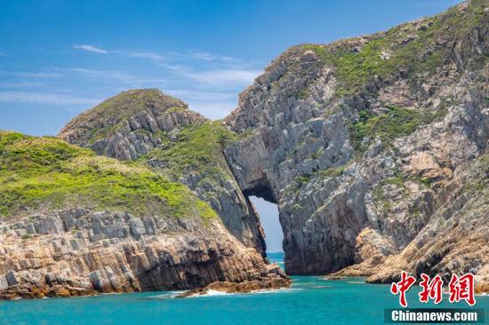 10月22日晚,香港特区政府渔农自然护理署宣布位于香港联合国教科文组织世界地质公园的早白垩世流纹质岩柱群入选为首百个国际地质科学联合会地质遗产地。图为香港西贡果洲群岛的早白垩世流纹质岩柱群。渔护署供图
