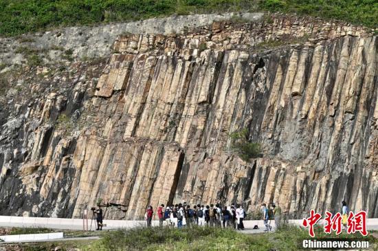 这组岩柱群分布在西贡东郊野公园粮船湾一带、滘西洲、吊钟洲、瓮缸群岛及果洲群岛等约100平方公里范围,覆盖陆地及海洋,岩柱的直径平均为1.2米,而最大更可达3米,露出地面的高度达100米。图为传媒参观西贡万宜水库东坝的早白垩世流纹质岩柱群。 李志华 摄