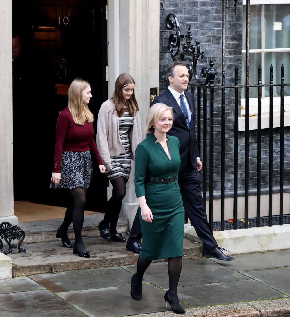 ↑10月25日,在英国伦敦,伊丽莎白·特拉斯在唐宁街10号首相府前发表卸任前最后一次讲话后准备离开。