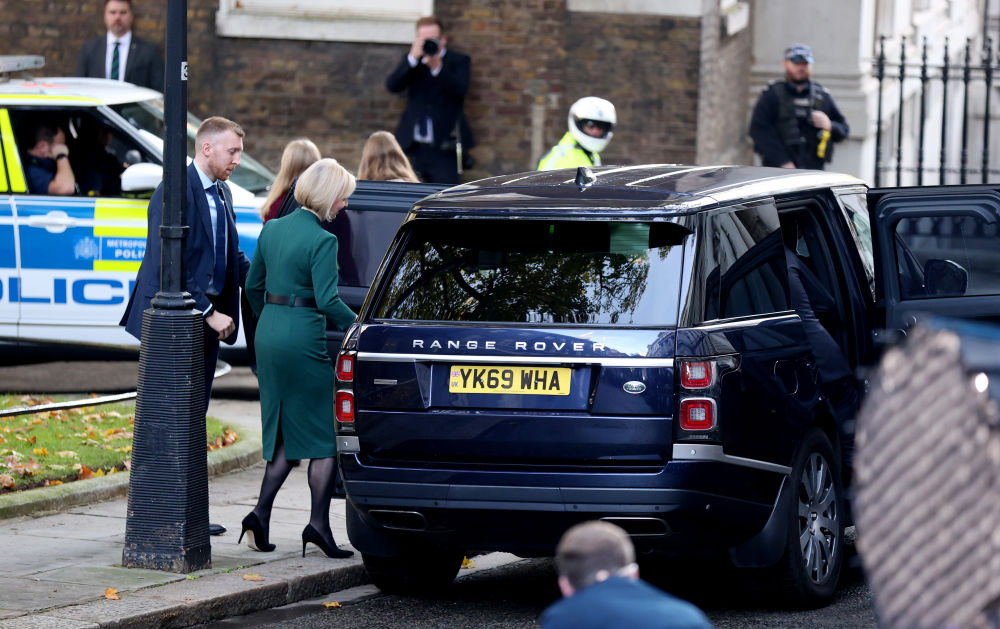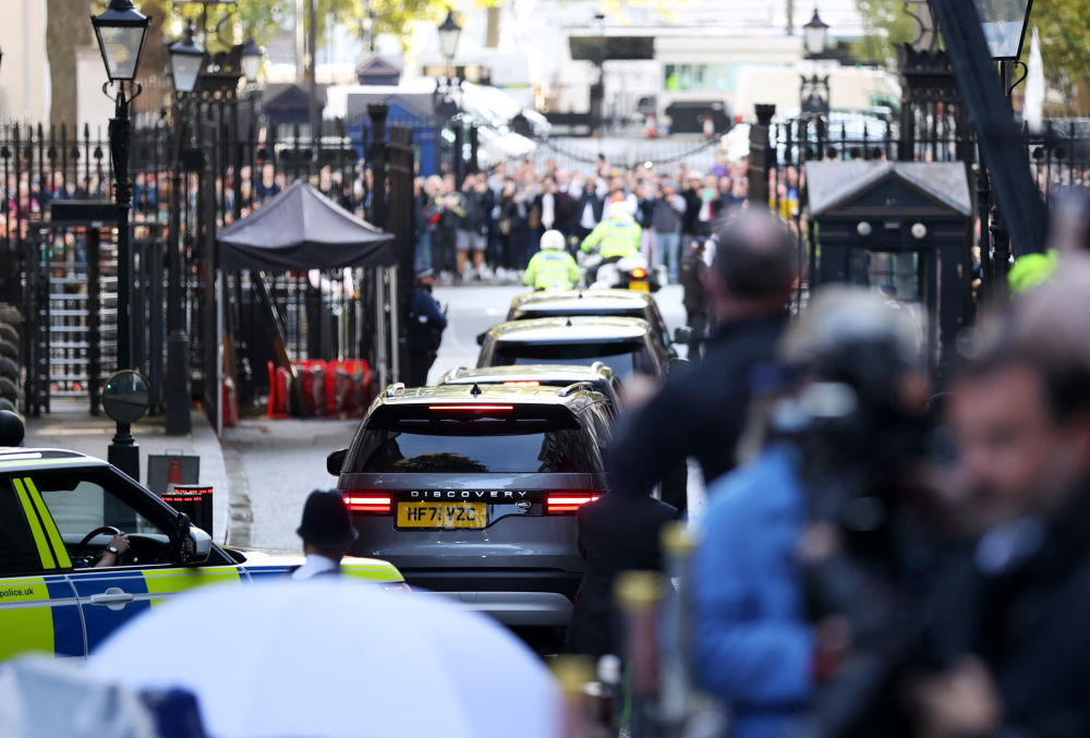 ↑10月25日,在英国伦敦,伊丽莎白·特拉斯在唐宁街10号首相府前发表卸任前最后一次讲话后乘车离开。