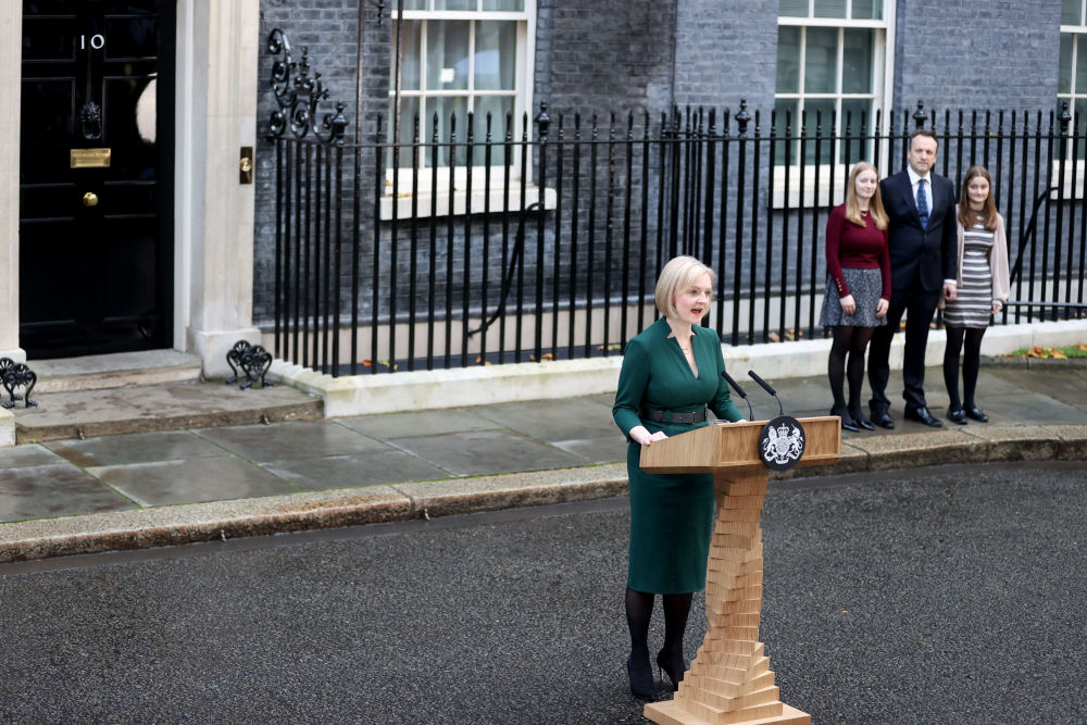 ↑10月25日,在英国伦敦,伊丽莎白·特拉斯在唐宁街10号首相府前发表卸任前最后一次讲话。