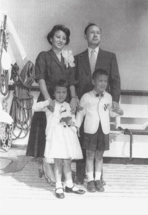 1955年钱学森一家启程回国时,在邮轮甲板上合影