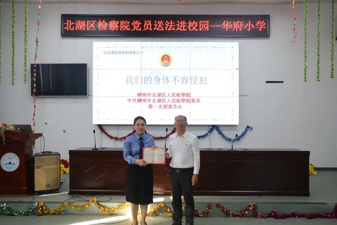 郴州市华府小学党支部书记谭志生为李维颁发法治副校长聘书。聘任仪式后,李维以“我们的身体不容侵犯”为主题,通过动漫视频、课件播放、互动答题的方式,让孩子们了解生活中哪些具体行为属于性侵害、如何防范性侵害以及遇到性侵害怎么应对等内容,同时,鼓励同学们要做自己身体的“小主人”,面对性侵害勇敢说“不”。