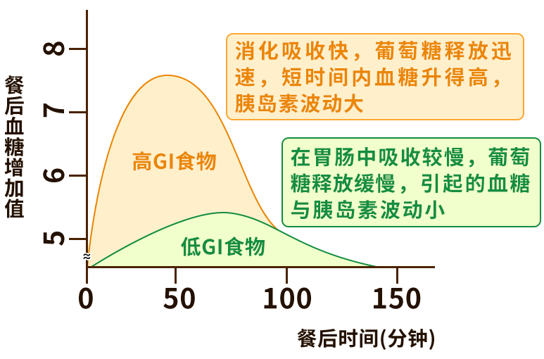 GI是食物的一种生理学参数,是衡量食物引起餐后血糖反应的一项有效指标。GI值高于70的食物为高GI食物,GI值低于55的食物为低GI食物。高GI食物进入胃肠后消化快、吸收率高,血糖升高得快;低GI食物在胃肠中停留时间长、吸收率低,升糖慢。