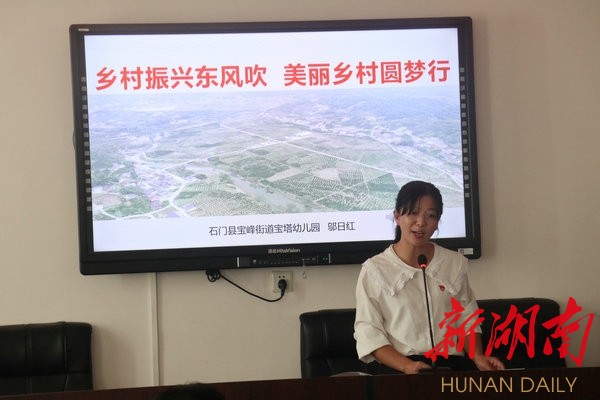 首先上台演讲的是宝塔幼儿园的邬日红老师,她激情讲述自己家乡维新镇中渡水村党支部带领群众建成千亩高标准脐橙产业园、清理整治河道、建设野生腊梅基地、齐力协力奔小康的故事,令人振奋。