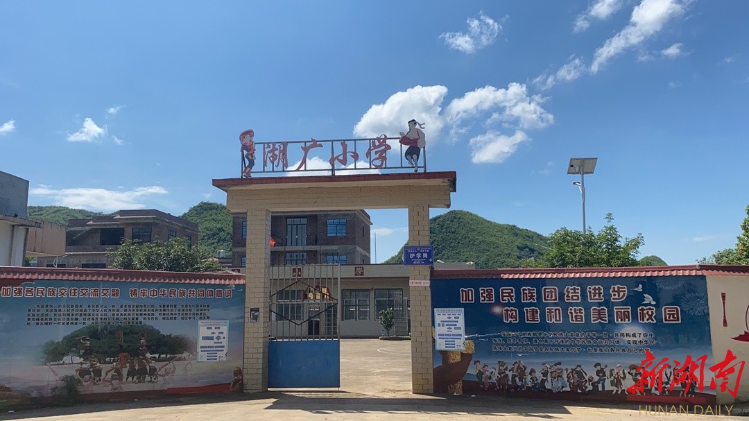 上世纪70年代,当地瑶胞腾出生产队一间仓库改制成教室,门板刷上漆就是黑板,村里低龄孩子求学于此,解决其上学路程远、山路险的问题;1977年,两省各拨专款450元,划土地、筹物资、献劳力,办起了学校。2010年,湖广村整体易地搬迁至山脚,两省各出资12.5万元易址新建校园;2013年,两地政府又共同筹资60多万元改建湖广小学,校门、围墙、食堂、运动场修葺一新。