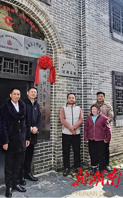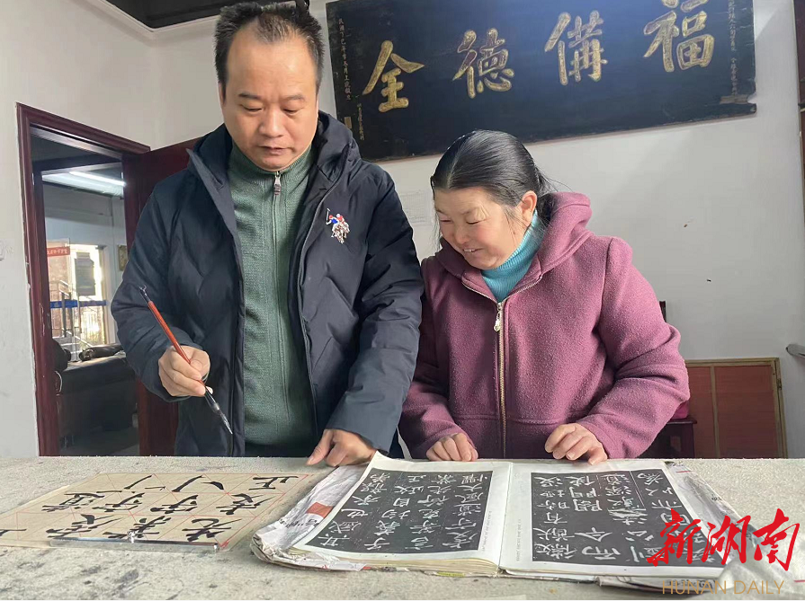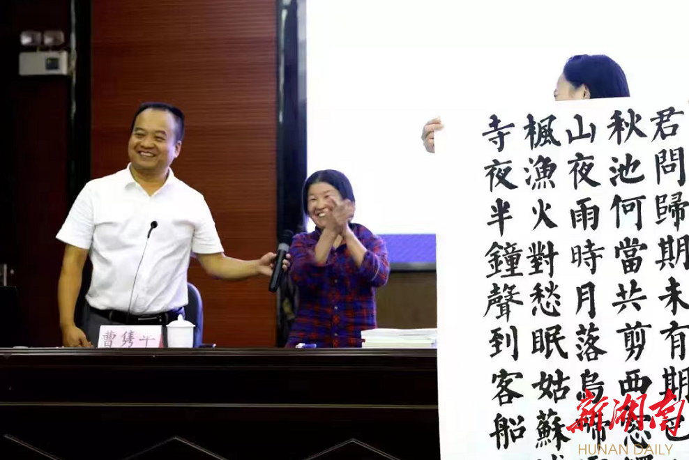 谭诗华说到的这位“曹馆长”,就是著名书法家、湖南省文化馆副馆长、《文艺生活·艺术中国》杂志主编曹隽平。在他的努力下,今年2月,沙洲村文学书法传习所挂牌,村民们扛锄头的手,开始翻开书本、拿起毛笔。文化的芬芳,馥郁了大山深处的乡村生活。