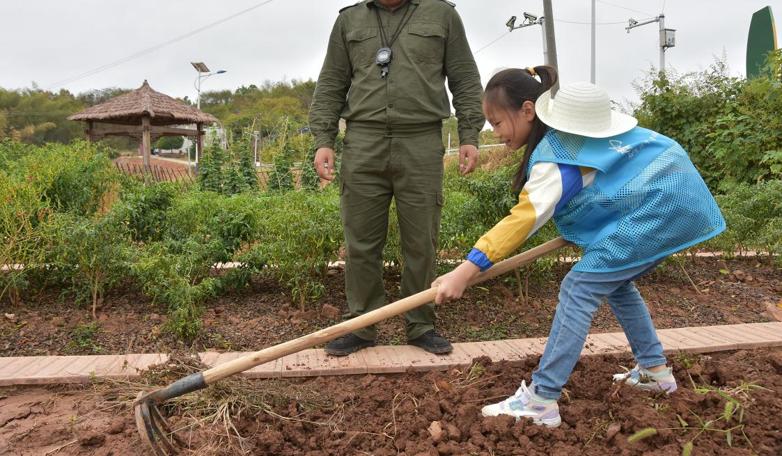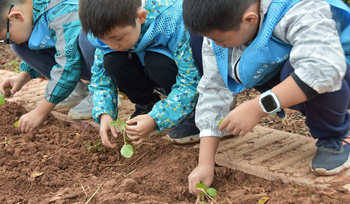 在教官的带领下,孩子们整齐划一前往实践教育区,沿途教官引导孩子们观察当季农作物,来到小菜园,首先教孩子们认识农具,四齿耙、锄头等的使用方法,示范如何松地、种菜苗。孩子们轮着体验用四齿耙松地,教官在一边耐心指导,直到每一个孩子学会,菜地也基本翻了一遍。“原来种菜这么辛苦啊!”“松地比我想象的难多了!”孩子们不时发出的感慨,一阵阵欢声笑语回荡在菜地上,城市孩子变身快乐小农夫,“挖、撬、拉!”配合着简单的口号松地、锄草、整地、凿坑、种菜苗就完成了,看着自己亲手种下的菜苗,孩子们开心不已。