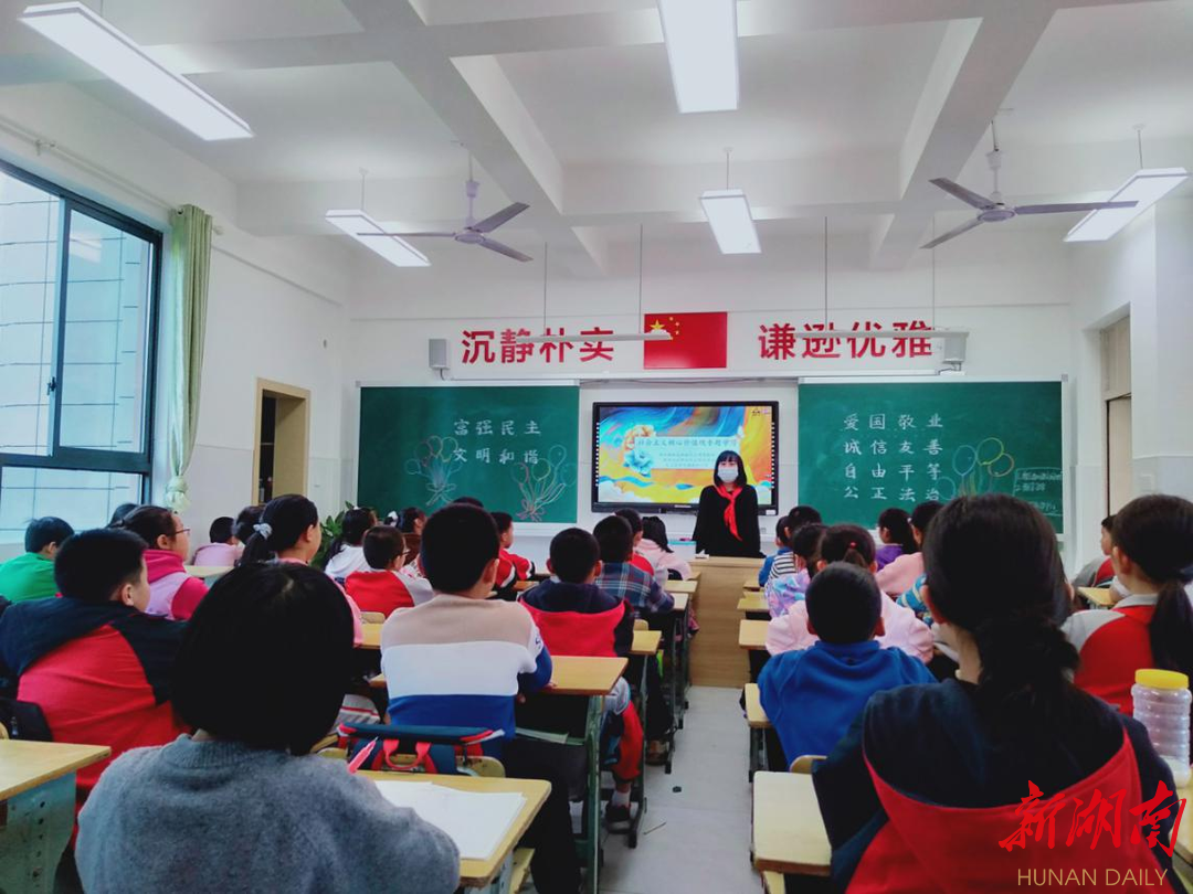 新湖南客户端10月12日(通讯员 高珊)10月11日下午,长沙市天心区赤岭路街道新时代文明实践所联合新丰社区新时代文明实践站、天心区仰天湖赤岭小学在该校六年级一班开展社会主义核心价值观宣传教育活动。