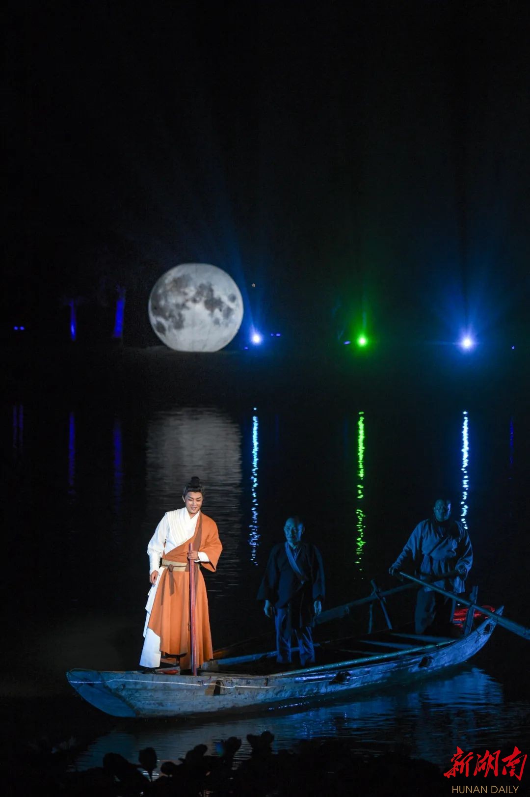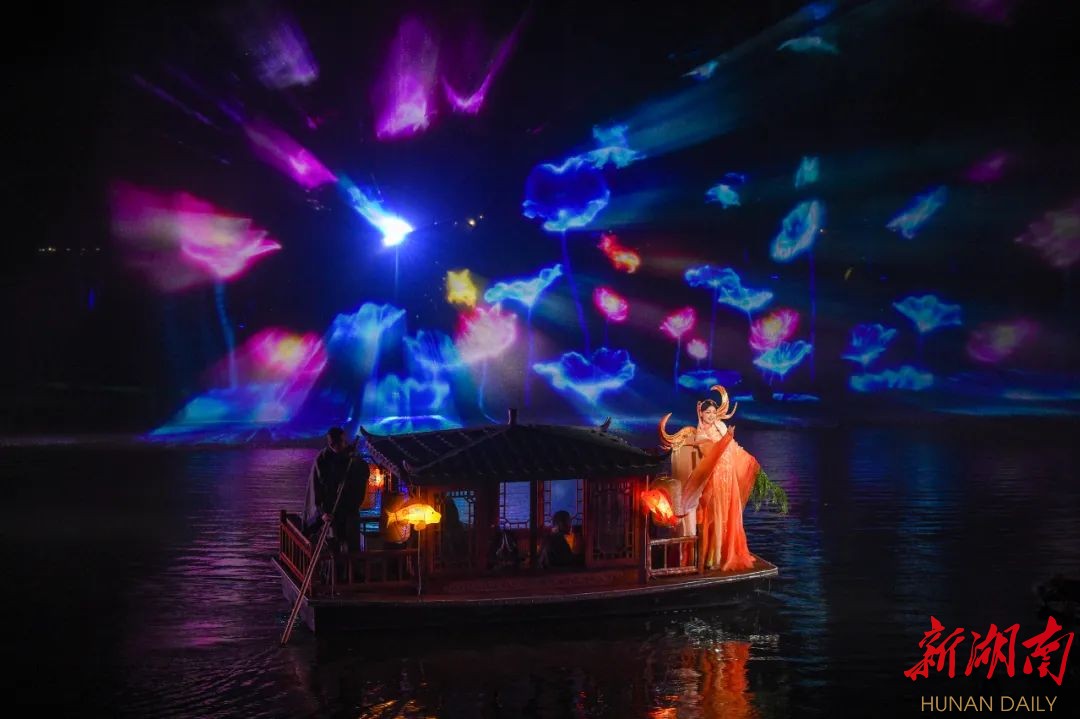 柳叶湖大型奇幻光影水秀《柳叶船说》在渔歌艺术营地试演