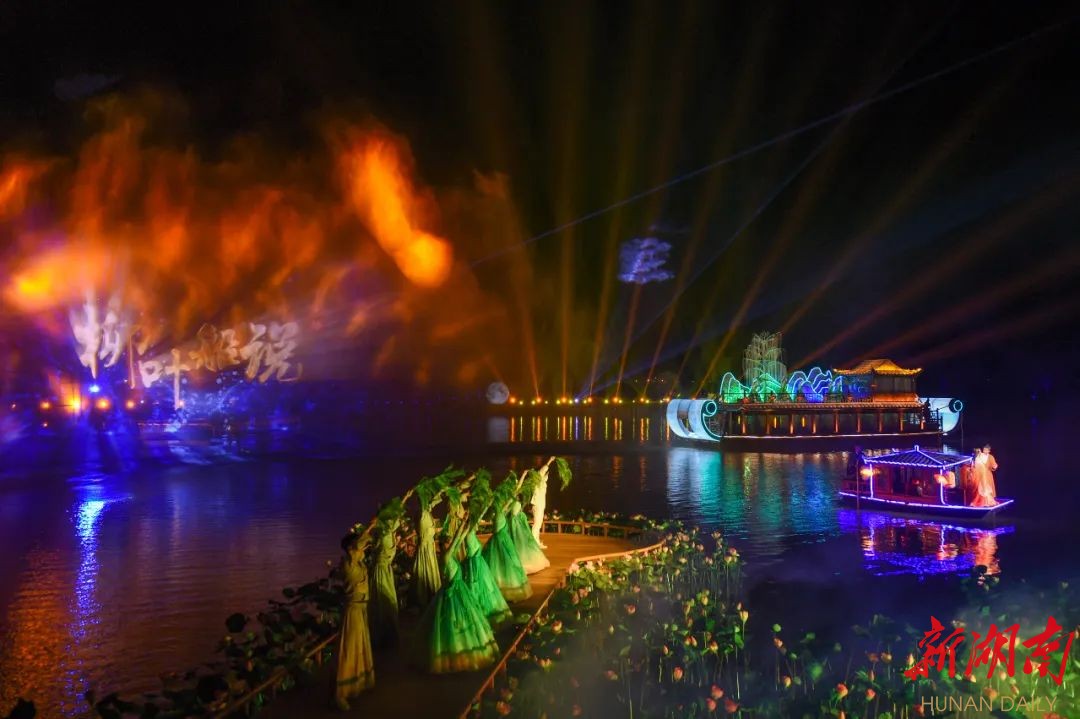 此次奇幻光影水秀由柳叶湖旅游度假区与湖南省演艺集团联袂打造,共分为《混沌初开 水滴云梦泽》《柳叶湖仙 修得同船渡》《大唐司马 刘郎今又来》《柳叶船说 逐梦新时代》四个篇章。该主题秀依托柳叶湖丰富多元的本土文化,在神话传说《盘古开天》、《刘海砍樵》的基础上,以“诗豪”刘禹锡的视角讲述了一段穿越千年的爱情传说。