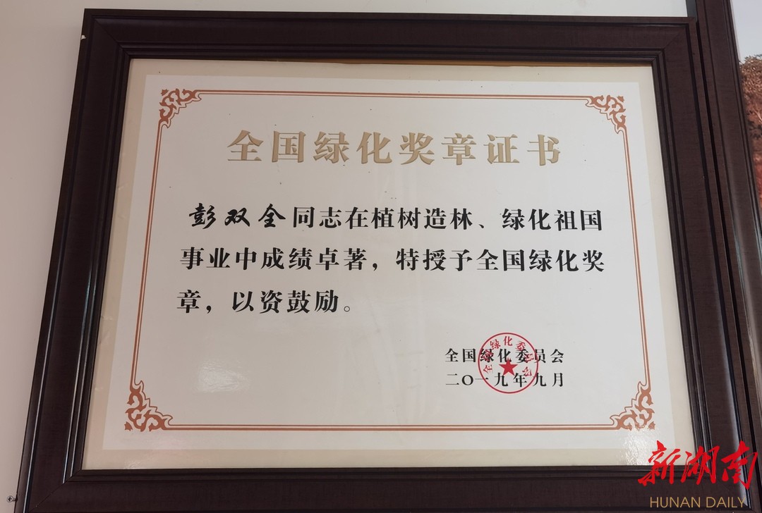 彭双全自己也获得“全国绿化奖章”。这是一枚被他“捧在手上、挂在心头”的奖章。在他获得的众多荣誉中,彭双全独独替它拍了照并悬挂在家中,证书也被装裱好挂起。