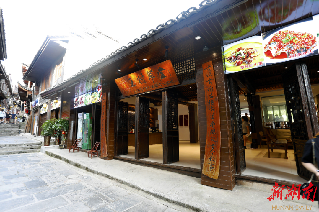 王村草堂坐落于五里石板街的中心点、芙蓉镇大瀑布之上,左右皆是当地人经营的门板店铺吊脚楼饕餮美食、当地特产、土家非遗等一应俱全,吃喝玩乐之余也可以满足所有购物欲。