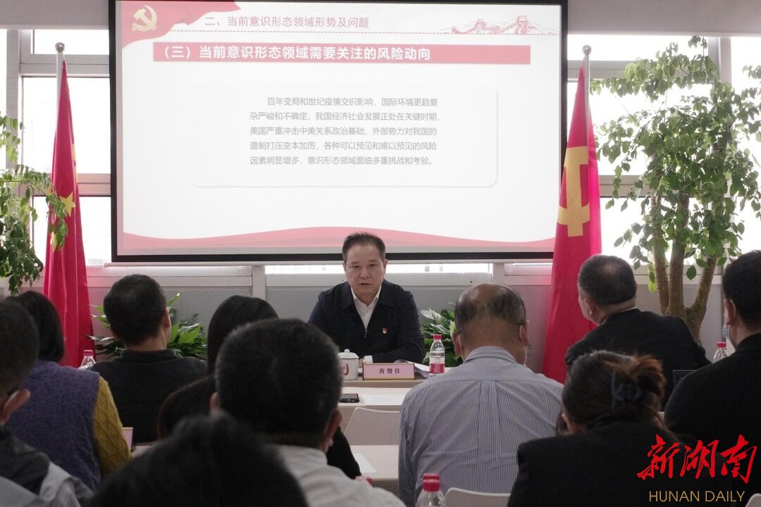 随后,黄赞佳以《牢牢掌握意识形态领导权 稳步走好伟大复兴新征程》为题,将理论与实际相结合、观点与事例相呼应、问题和方法同探究,从习近平总书记关于加强意识形态工作的重要论述、当前意识形态领域形势及问题和如何做好意识形态工作等三个部分讲授专题党课。