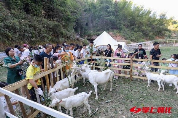 10月2日,会同县林城镇龙坡村常羊奶山羊养殖基地内,游客们正体验牧场特色亲子游活动。