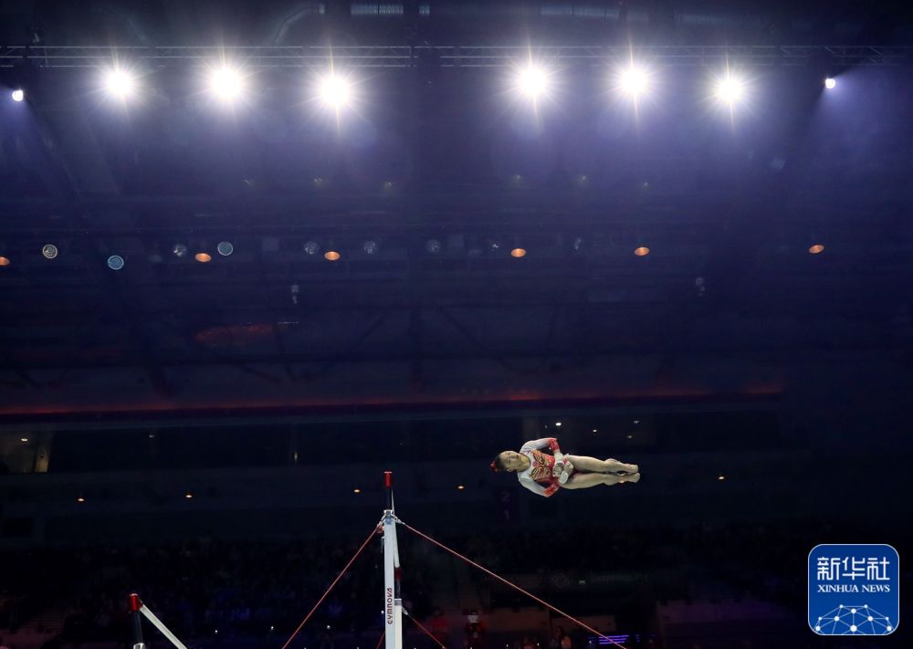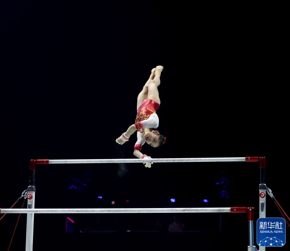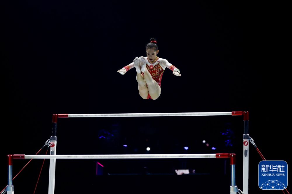 ↑中国队选手罗蕊在高低杠比赛中。新华社记者 李颖 摄