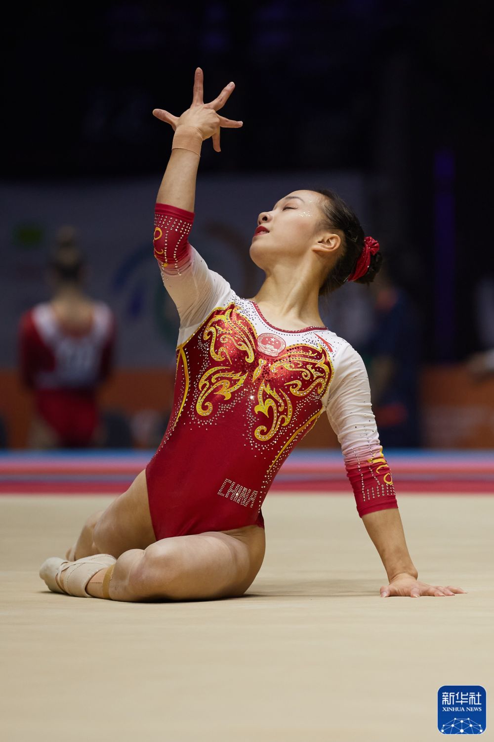 ↑中国队选手唐茜靖在自由操比赛中。新华社记者 李颖 摄