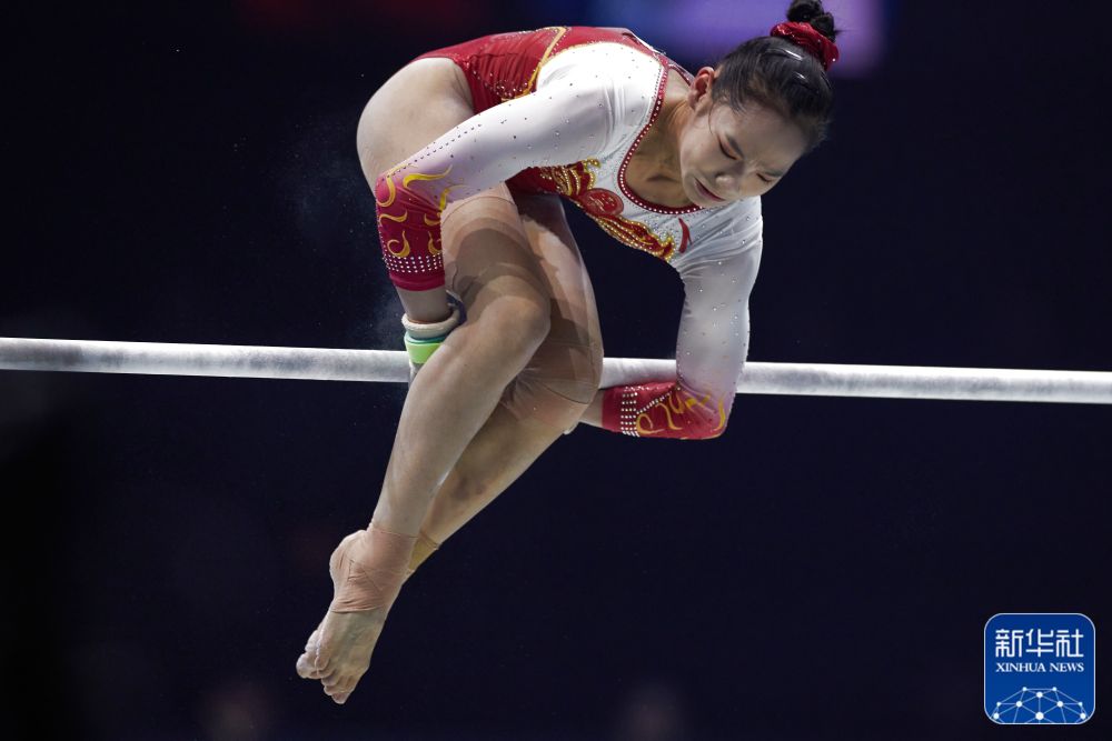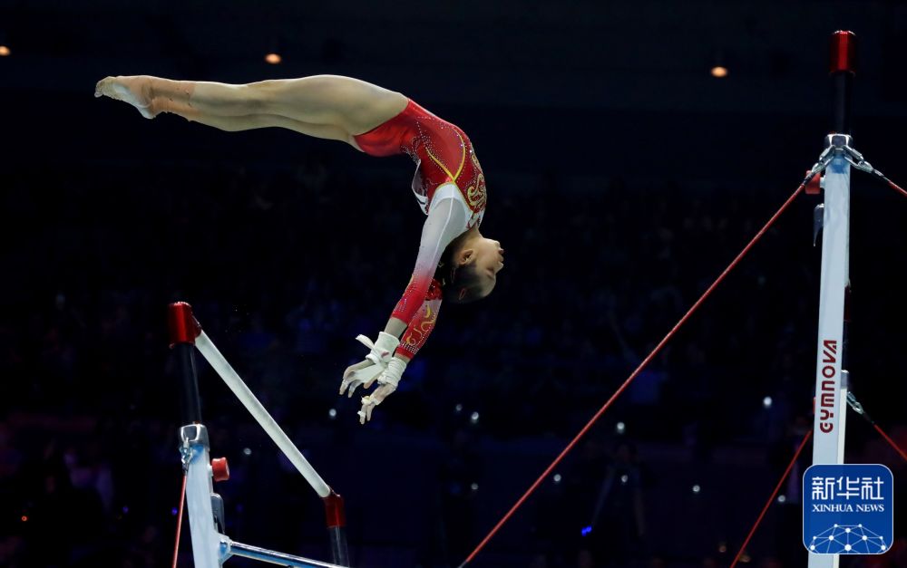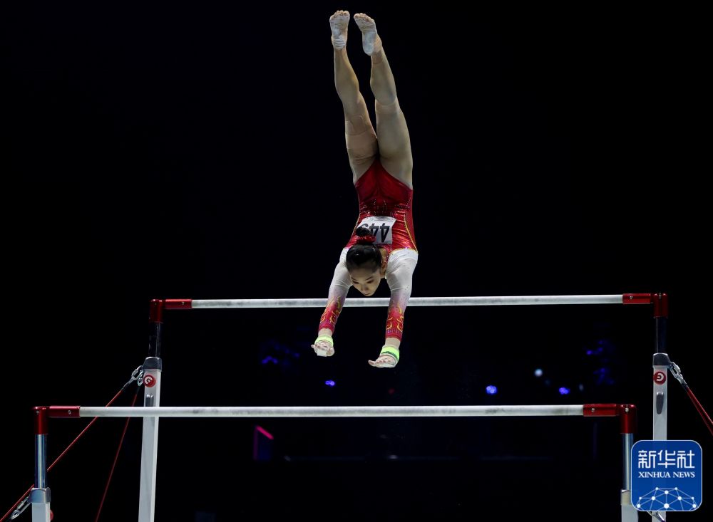↑中国队选手唐茜靖在高低杠比赛中。新华社记者 李颖 摄