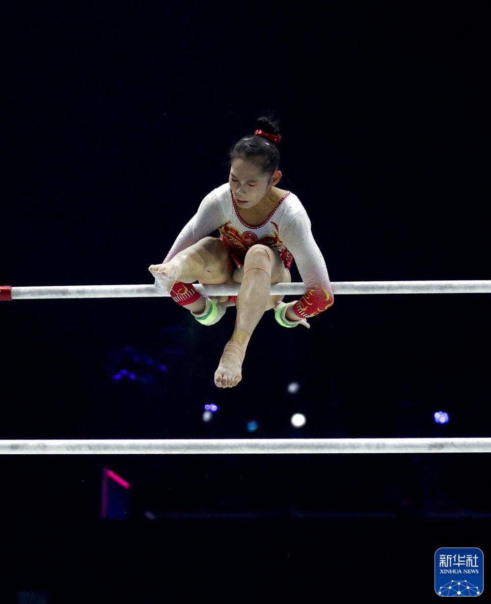 ↑中国队选手韦筱圆在高低杠比赛中。新华社记者 孟鼎博 摄