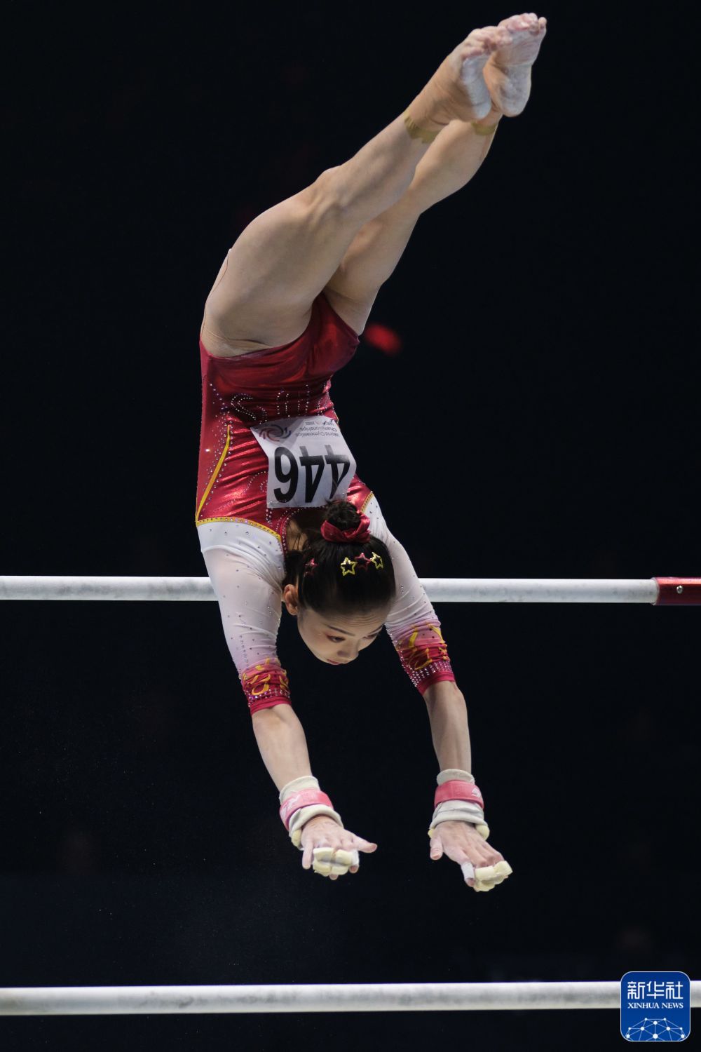 ↑中国队选手韦筱圆在高低杠比赛中。新华社记者 李颖 摄