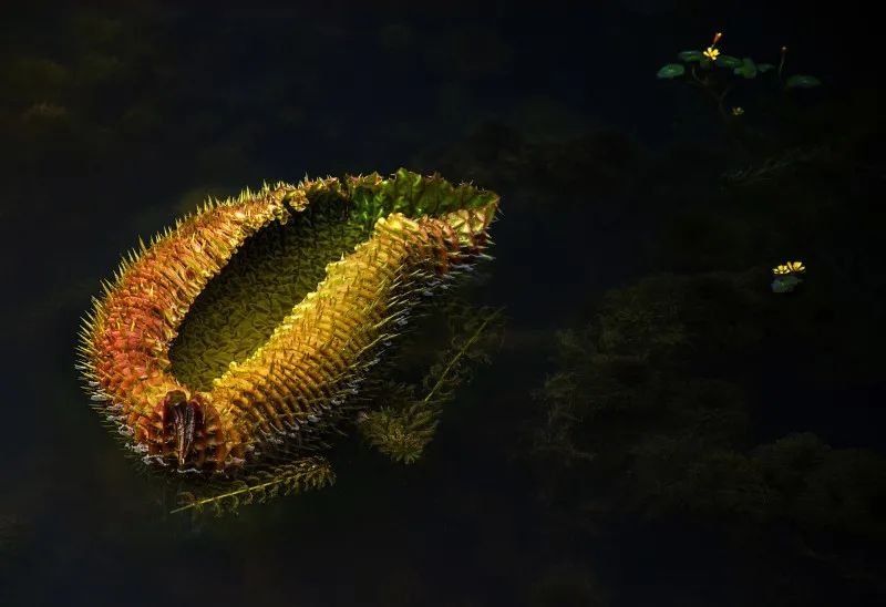 亚马孙王莲叶片从水底冒出。图片来源:NikonClub Singapore在水下时,王莲的叶芽已经完成分化,尽管到达水面时仍是一个芽,但它生长十分迅速,能快速地扩充。叶子不断长大的同时,向周围不停地伸展,王莲叶背的刺在生长和伸展时,还可以倾轧周围的植物。