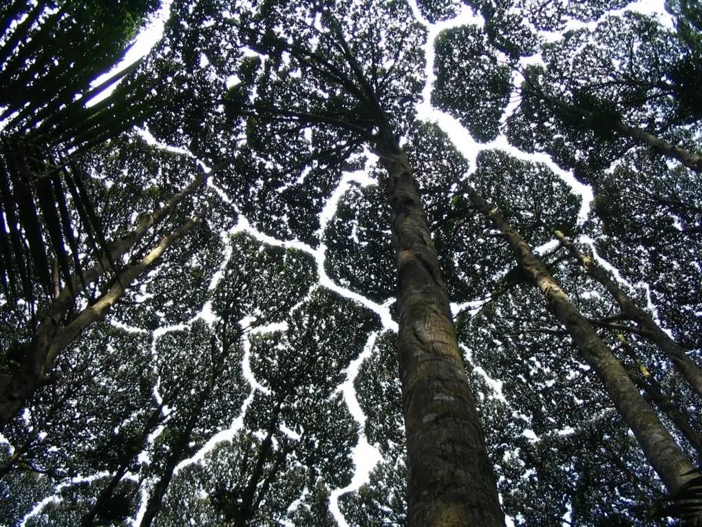你可能会在森林的冠层中看到过这种现象:树与树之间留有缝隙,仿佛彼此留有“情面”一样,但这种叫作林冠羞避的现象很可能也不是它们互相礼让,更可能是它们斗争过后留下的痕迹。几颗树的枝杈互相侵扰彼此的空间后,它们虽然不直接出手“打架”,但冠层间的风会让它们“短兵相接”。就这样,经过长期物理磨损后,才在冠层间留下了这默契的缝隙,给底层的植物留出了阳光。