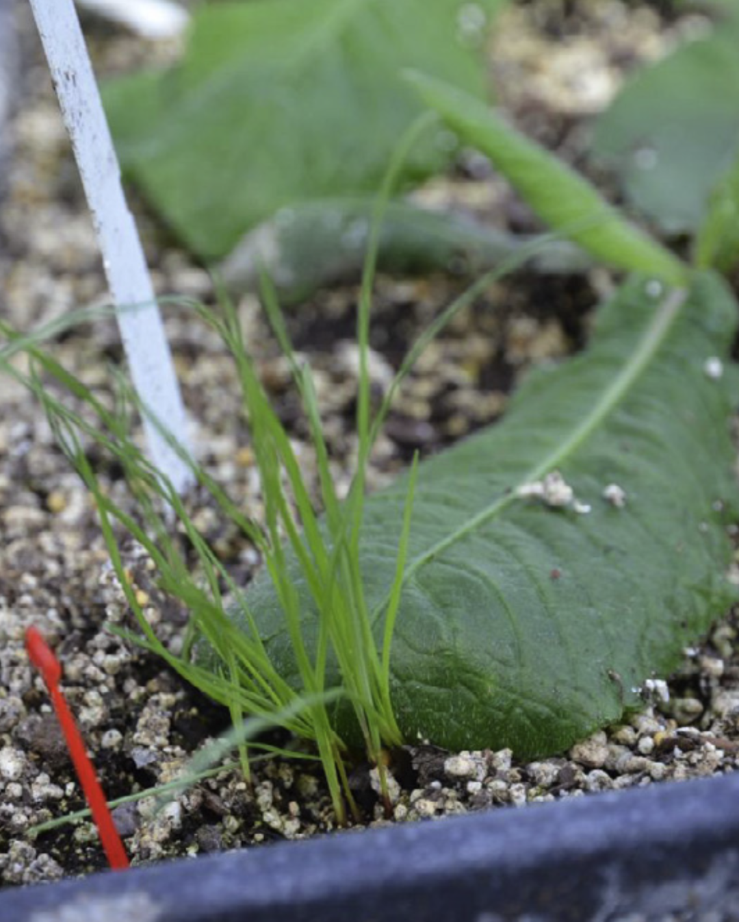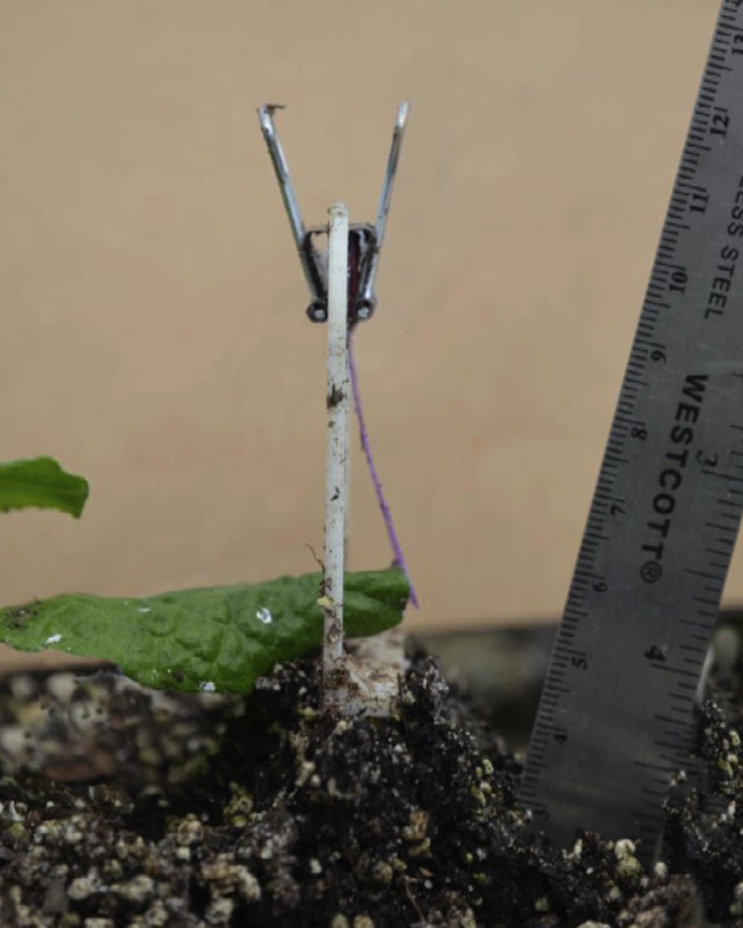 地胆草的躺平姿态。图片来源:phytoimages.siu在这种生长模式下,它们很快就会被快速冒出来的草遮蔽掉。有意思的是,它们莲座状的叶子虽然没有办法在地表的垂直方向表现出竞争力,但它们可以“步步为营”。它们的叶片在生长的时候,叶片边缘向内卷曲,像一个托盘倒扣在地面上一样,以此来获得抓地力,这样叶片快速伸长的时候,就能把附近冒出来的草苗推开,不让自己的区域被遮蔽。这样一来,四散开来的地表叶就可以在地表抢地盘了。科研人员从野外生境中移植了地胆草用于做实验,在它们叶子生长的方向上插了一根塑料管,塑料管上安装了微型的测力仪器。研究发现,通过在地上匍匐生长,地胆草用叶尖不停往前推,叶片平均能推出0.018N的力,最大时能达到0.2N。