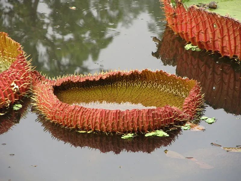 比如生长于亚马孙的王莲(Victoria amazonica),它们莲如其名,霸主气质让人拍案叫绝。在亚马孙,王莲要从河面冒出来的时候,河面可能已经被其他水生植物塞满了。对那些适应水面生境的植物来说,水面可是一个优越的所在,不缺阳光,能自由移动。因此在生长季来临的时候,植物熙熙攘攘,水面的竞争如非洲草原一般激烈。可惜的是,这些浮水植物的优胜只是一时的,王莲在叶子冒出水面之前就已经在蓄力了。作为沉水植物,它们有根系扎在土壤之中为它们稳固身形,它们的叶子被叶柄托举出水面时,王莲就已经做好准备开战了。