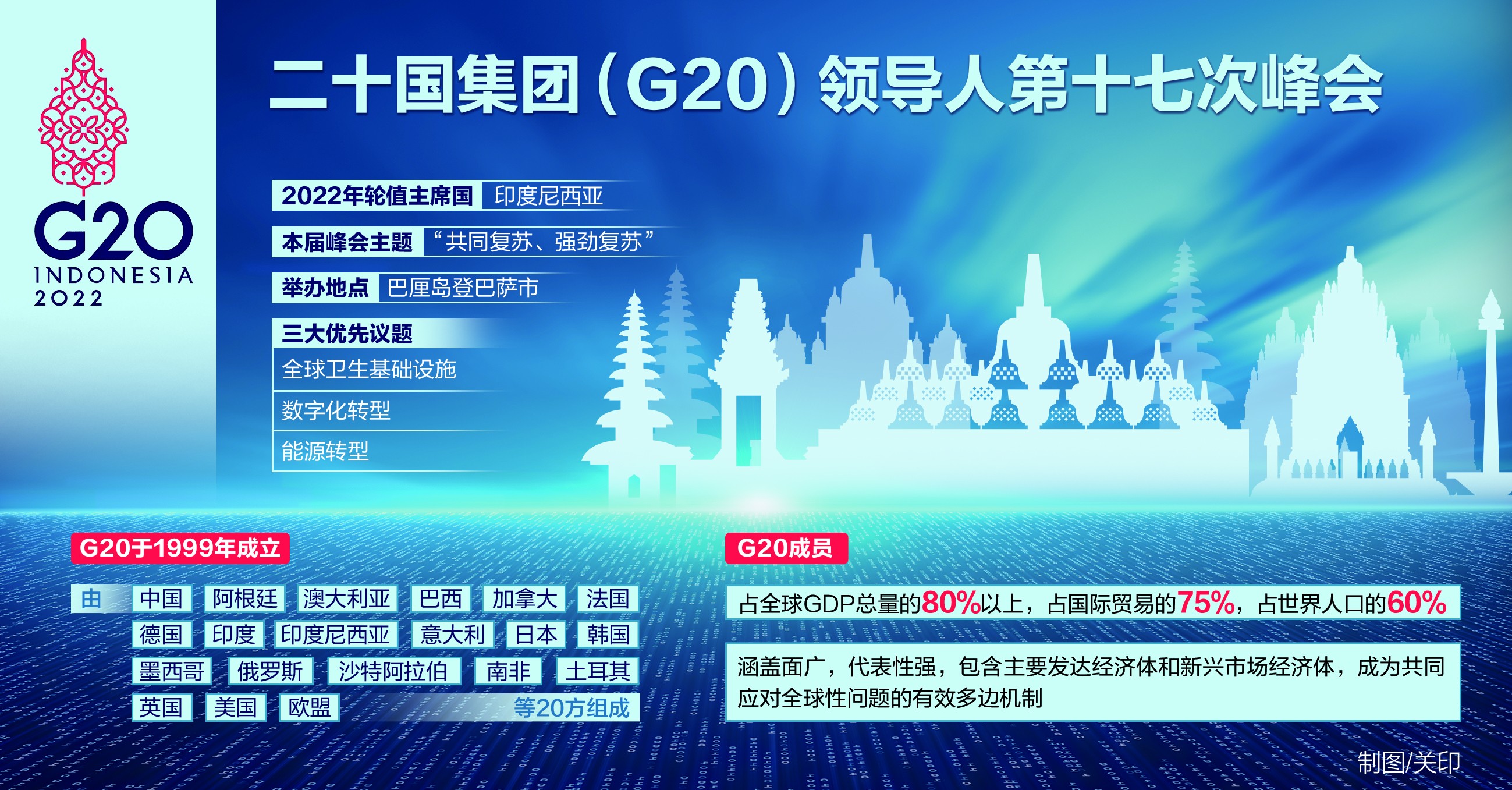 二十国集团(G20)领导人第十七次峰会将于11月15日至16日在印度尼西亚巴厘岛举办,本届峰会将围绕“共同复苏、强劲复苏”这一主题展开。当前全球抗疫和经济复苏正处于关键时期,多领域危机叠加共振,因此今年峰会的全球关注度也更胜从前。