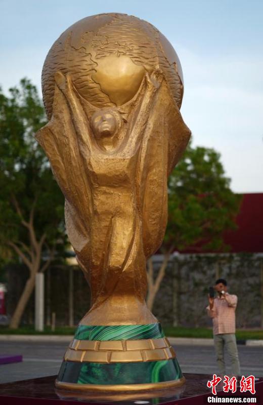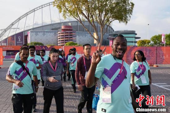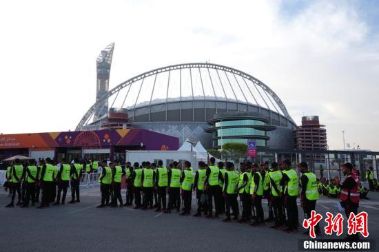 工作人员集结,准备进入哈里发国际体育场。(中新社记者 崔楠 摄)