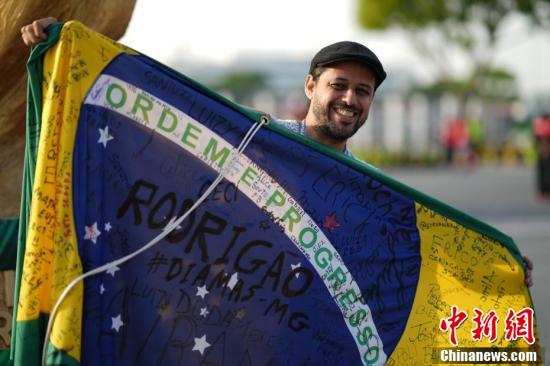 卡塔尔多哈,来自巴西的Anderson,在哈里发国际体育场外,展示签满其友人名字的巴西国旗。
