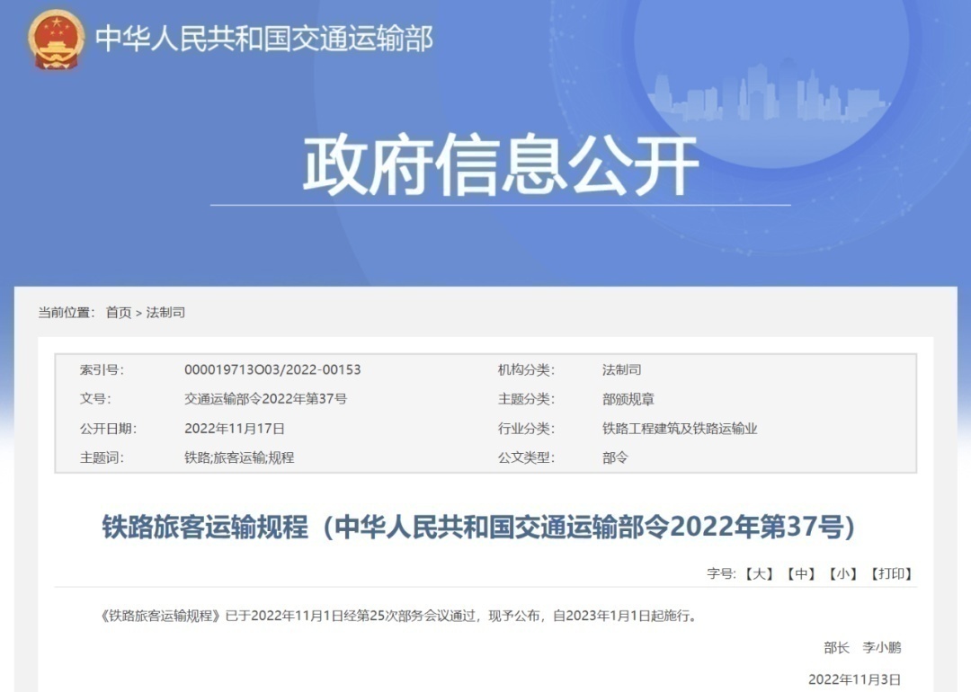 17日,交通运输部网站公布修订后的《铁路旅客运输规程》,自2023年1月1日起施行。