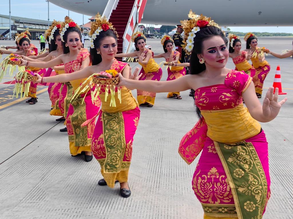 礼兵分列红地毯两侧致敬,身着民族服装的当地青年演奏起印尼传统乐器伽美兰,盛装印尼女青年跳起巴厘岛传统舞蹈“朋德舞”,当地学生挥舞中国和印尼两国国旗,用中文欢呼“欢迎,欢迎!”