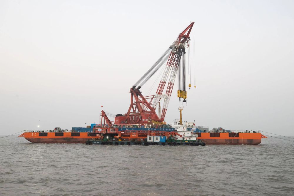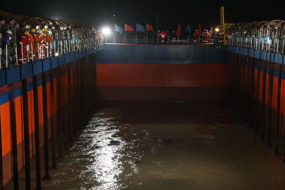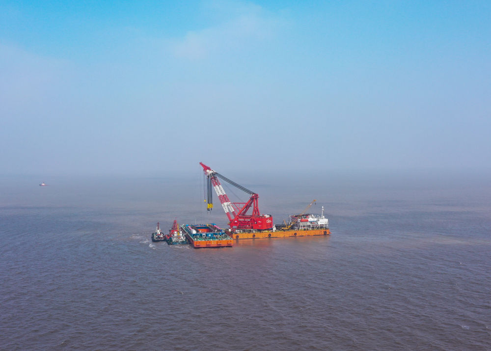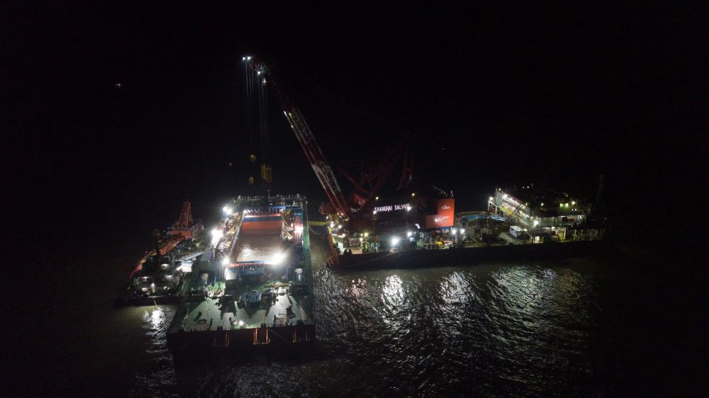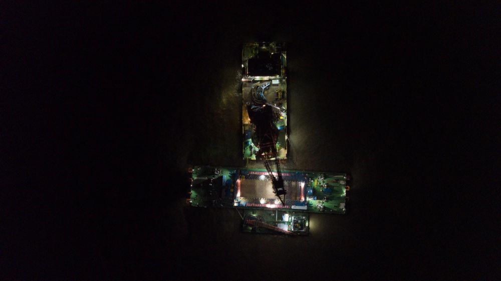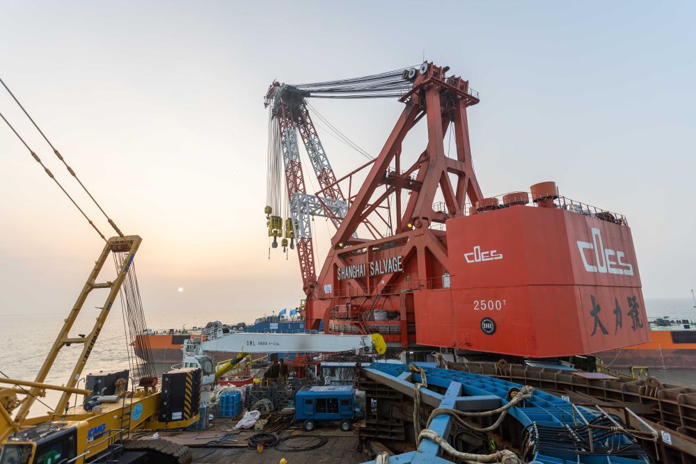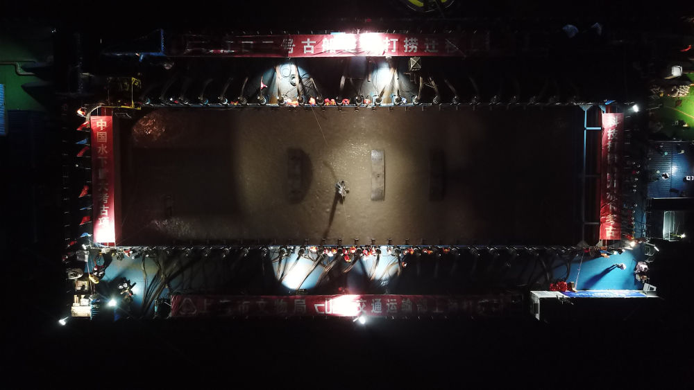 从20日夜间到21日凌晨,万吨“大力”号与我国自主研发的古船整体打捞专用工程船“奋力”轮携手,在长江口二号古船所在长江口横沙水域完成各项调试,启动智慧打捞监控系统,对这艘清代沉船实施水下整体打捞。