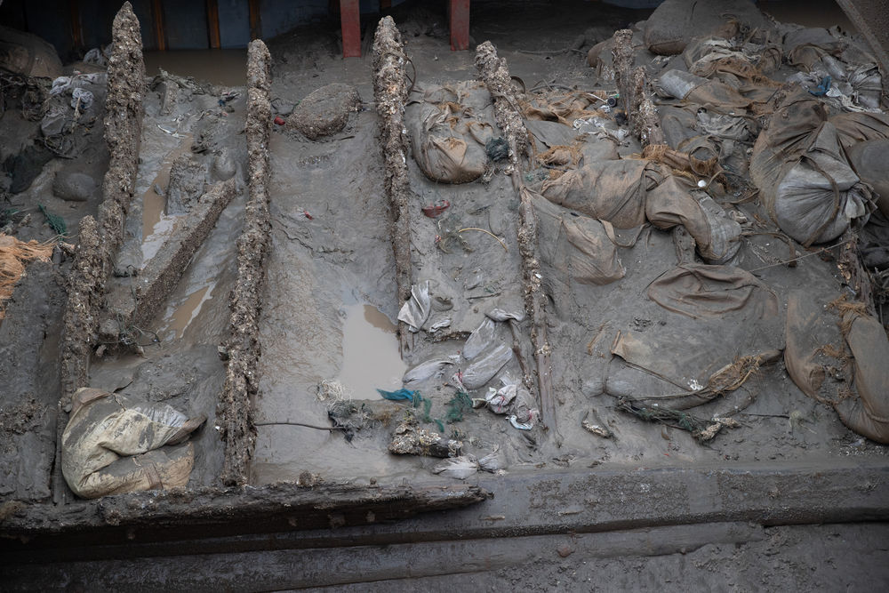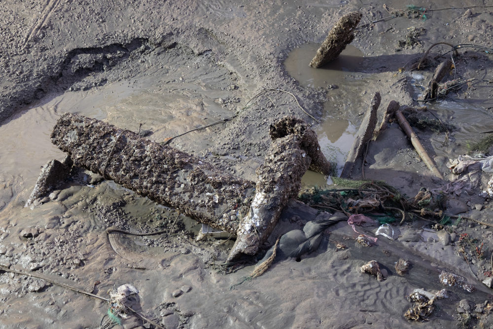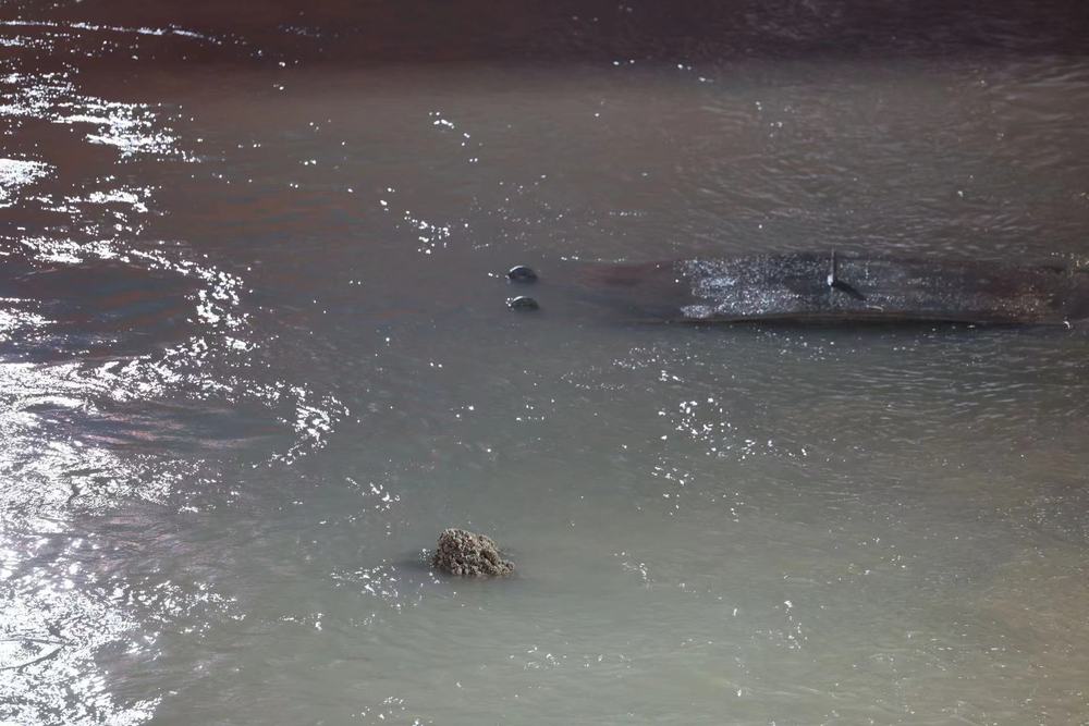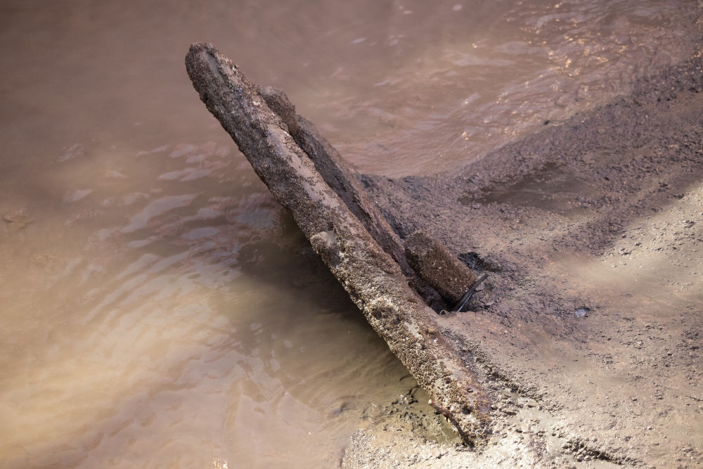 ↑ 11月21日清晨拍摄的露出水面的古船船体局部。