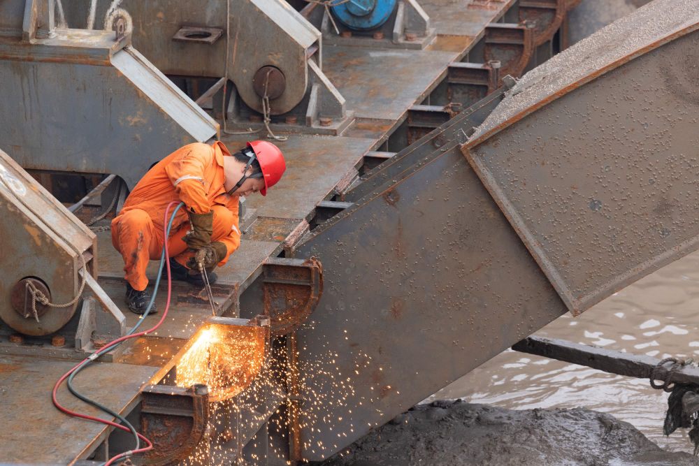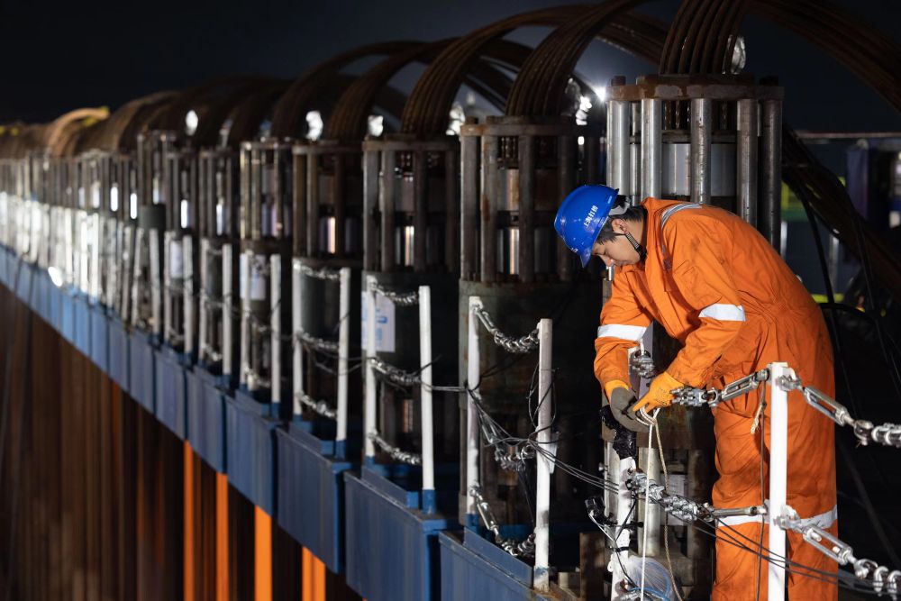 ↑11月21日,工作人员下水给桅杆“穿上”保护衣。