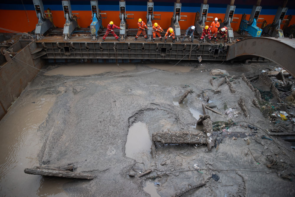 ↑11月20日拍摄的长江口二号古船整体打捞现场。