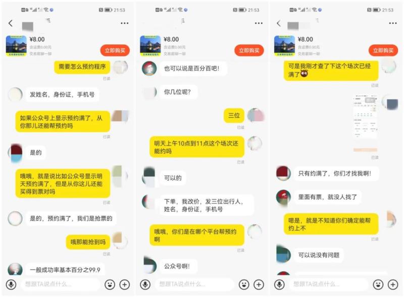 一名卖家在了解了入园时间和人数后告诉记者,只要提供入园人姓名、身份证号、手机号便可代预约。即使博物馆官方渠道显示预约已满,依然“几乎百分百”的概率可以帮忙预约得到,“也可以说是百分百吧,我们是抢票的。”