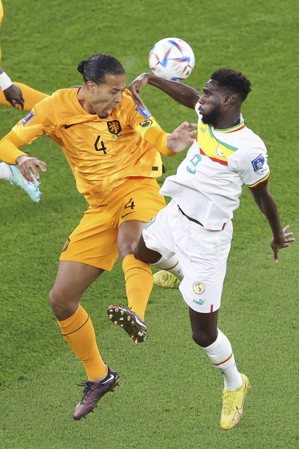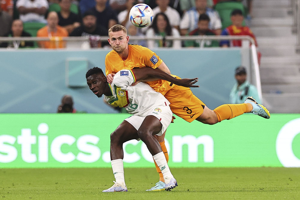 11月21日,荷兰队球员德里赫特(上)与塞内加尔队球员伊斯梅拉·萨尔在比赛中拼抢。新华社记者丁旭摄