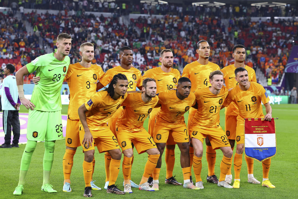 11月21日,荷兰队首发阵容在比赛开始前合影。新华社记者丁旭摄