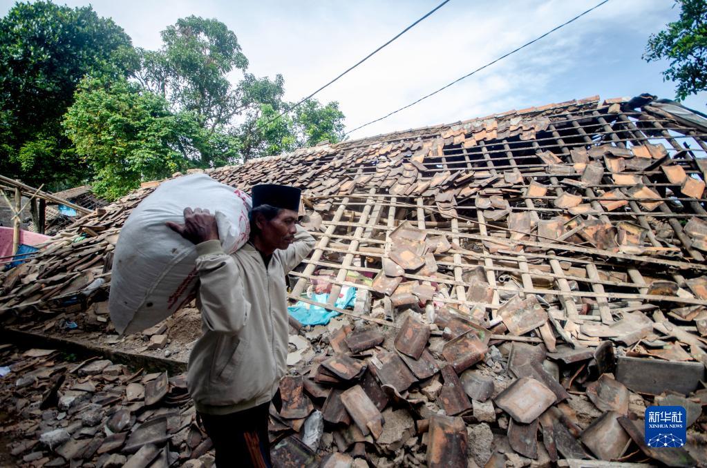 11月22日,在印度尼西亚西爪哇省展玉地区,一名男子从被地震损坏的房屋前走过。印度尼西亚西爪哇省21日发生5.6级地震,造成众多人员伤亡,多处房屋和基础设施倒塌。目前救援工作正在进行中。新华社发(赛普蒂安贾尔摄)