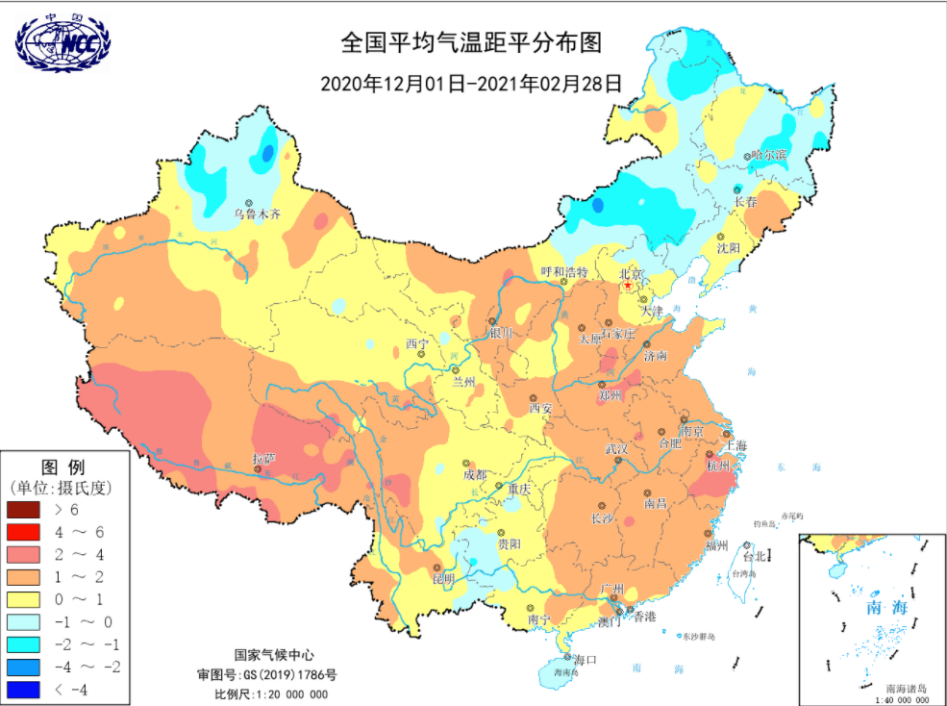 2020-21年冬季全国平均气温距平(偏离1981-2010年气候平均态的状况)。虽然这个冬季出现了多次强寒潮,东北等地也有所偏冷,但全国平均还是显著偏高,被判定为一个暖冬。图源:国家气候中心