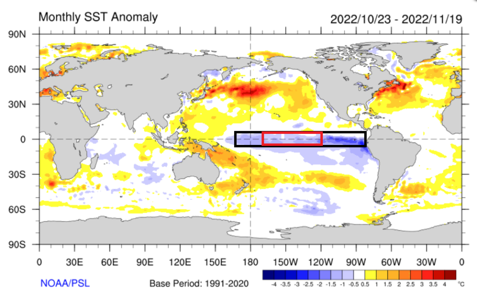 最近一个月(10月23日-11月19日)全球海表温度距平(偏离1991-2020年平均值的状况)分布(单位:℃),可以看到赤道中东太平洋呈现显著偏冷,表明拉尼娜正在发展。图源:美国国家海洋与大气管理局(NOAA)