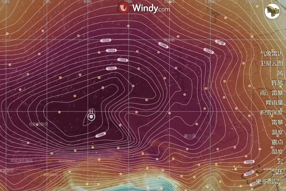 先前数值模式预报的西伯利亚极强高压。图源:Windy