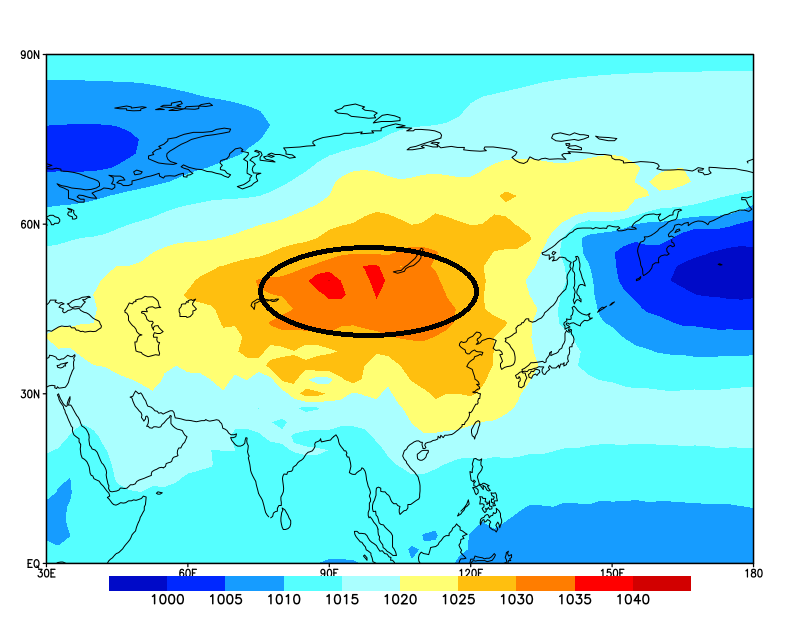 1991-2020年冬季(12-2月平均)亚洲地区海平面气压图(填色,单位:hPa)。图中黑色椭圆标注的高压即蒙古-西伯利亚高压