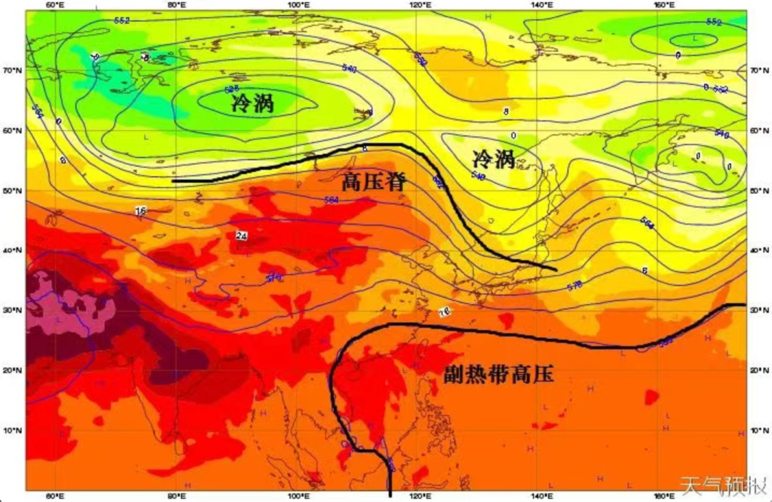 高压脊示意图(非本次寒潮过程),指水平气压场上等压线向气压较低一方突出的脊状部分