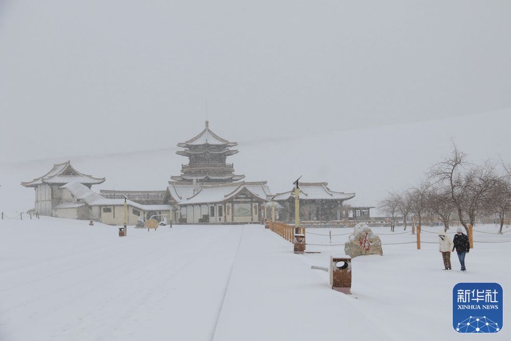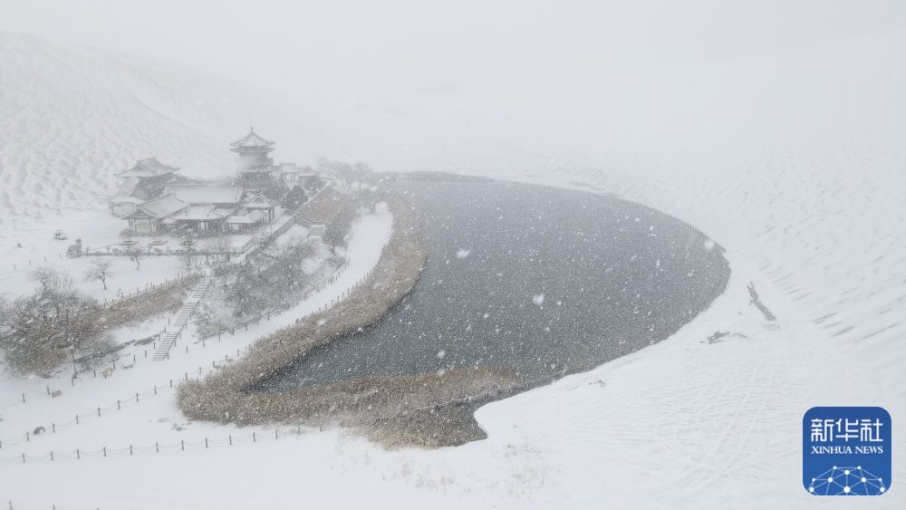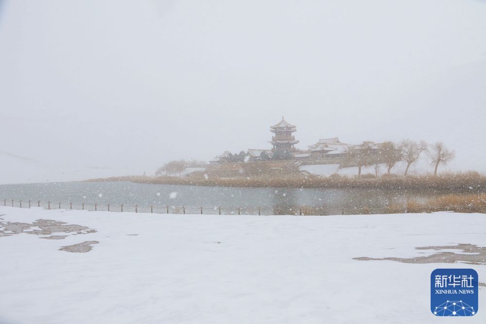 当日,甘肃敦煌迎来降雪。当地著名景点鸣沙山月牙泉银装素裹、分外迷人。